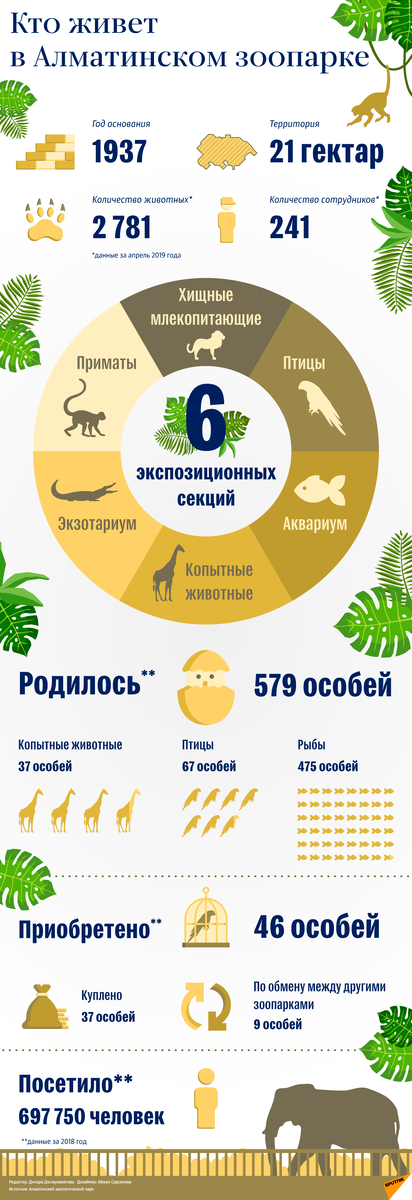 Алматинский зоопарк возрождается после череды скандалов с гибелью животных в 2015-2017 годах. На сегодняшний день в коллекции зоопарка 310 видов и 2 781 экземпляр животных В последние два года наблюдается тенденция к активному размножению животных, в том числе и представителей редких видов, сообщили в Алматинском зоопарке на запрос Sputnik Казахстан. В 2018 году приплод составил 579 особей. В их числе африканский жираф, индийские дикобразы, голубой гну, сайгаки, зебры, пони и многие другие. Еще 46 особей редких животных приобретено либо получено по обмену от других зоопарков. В настоящее время отремонтировано большинство вольеров для животных, завезены виды, прежде никогда не входившие в экспозицию зоопарка, заявляют в администрации. Экспозиция зоопарка состоит из шести секций: хищные млекопитающие, птицы, копытные, аквариум, экзотариум и приматы. Общее количество животных, представленных в них, постоянно меняется.