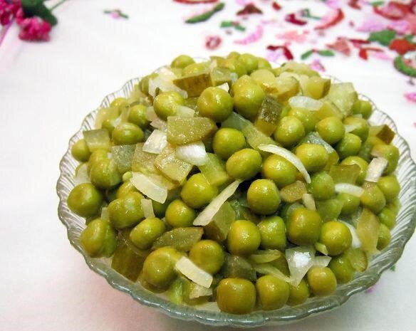 Предлагаю приготовить вам салат из консервированного гороха, в котором еще есть маринованный лук, соленые огурцы. Все готовится просто и быстро и, к тому же, получается такой салат вкусным. Продукты - одна банка консервированного горошка (425 грамм); - 200 грамм соленых огурцов, можете взять маринованных огурцов, если соленые вам не нравятся (250 грамм); - 100 грамм репчатого лука; - две столовые ложки оливкового масла; - одна чайная ложка горчицы; - две столовые ложки сахара + пол чайной ложки для заправки салата; - две столовые ложки девятипроцентного уксуса; - соль берите по вкусу. Приготовление 1. Вскипятите 250 миллилитров воды. 2. Лук очистите и нарежьте на небольшие кубики. 3. Замаринуем лук. Для того чтобы его замариновать, добавьте к луку одну чайную ложку соли, две столовые ложки сахара и уксус. 4. Затем залейте лук вскипяченной водой и перемешайте. 5. Оставьте его на 20-30 минут (спустя время сразу слейте воду). 6. Пока маринуется лук, вы можете нарезать огурцы на кубики.