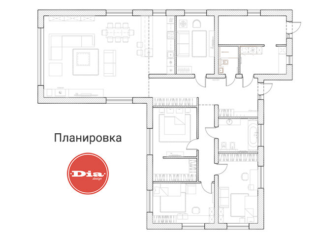 Площадь: 184 кв.м. Вид помещения: коттедж Место нахождения объекта: Минск Интерьерпросторного коттеджа сочетает в себе элементы экспрессивного стиля ар-деко и оформление очаровательной Скандинавии. Дизайнеры Студии DIAиспользовали сходную цветовую гамму от комнаты к комнате, чтобы связать каждое предыдущее помещение с новым. Нежно-серые и белые цвета были приняты за основу, но каждая комната получила свои особенные яркие и эффектные акценты. ПЛАНИРОВОЧНОЕ РЕШЕНИЕ По проекту, утвержденному Заказчиками, в интерьере коттеджапоявилась просторная совмещенная кухня-гостиная, три спальни, комната для гостей и даже терраса с садом, полным зелени. ГОСТИНАЯ В дизайне интерьера гостиной четко прослеживаются элементы стиля ар-деко: сочный лимонный и насыщенный винный цвет в оформлении обивки мягкой мебели, массивные и эффектные люстры, делающие акцент на обеденной зоне, минималистичные невесомые конструкции стеллажей и многочисленный декор. В функциональном зонированиине участвуют никакие перегор