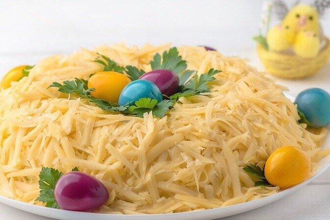 Вкусный, сытный, праздничный салат на Пасхальный стол. Так же расскажу как покрасить яйца натуральными красителями. Ингредиенты: 1. Отварное мясо - 200 гр. 2. Шампиньоны - 300 гр. 3. Отварной картофель - 2 шт. 4. Куриные вареные яйца - 4 шт. 5. Твердый сыр - 200 гр. 6. Соль. Петрушка. Растительное масло - для жарки. 7. Майонез. Для покраски перепелиных яиц натуральными красителями: 1. Перепелиные яйца - 9 шт. 2. Краснокочанная капуста - 150 гр. 3. Свекла - 150 гр. 4. Куркума - 1 ч. ложка. Способ приготовления: 1. Начнем с приготовления натуральных красителей для перепелиных яиц. Для голубого красителя необходимо нашинковать краснокочанную капусту. Нашинкованную капусту отправить в кастрюлю, залить водой и отправить на плиту. Варить 20 минут. Горячий краситель перелить в глубокую емкость. Для красного красителя необходимо на терке натереть сырую свеклу, переложить в глубокую емкость и залить крутым кипятком (200 мл.). Дать настояться 15 минут. Готовый краситель нужно процедить