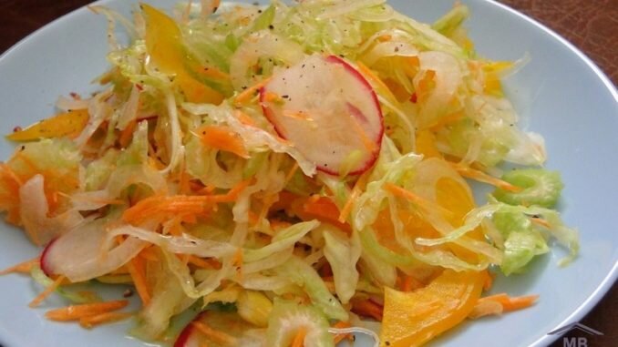 Кладезь витаминов и пользы для организма в простом салатике! Приготовьте и убедитесь сами! Ингредиенты: 150 грамм салата «Айсберг», 1 сладкий перец, 3 стебля сельдерея, 1 небольшая морковка, 4-5 штук редиски, 1 небольшая луковица, соль – по вкусу, оливковое масло – для заправки. Процесс приготовления: Овощи промыть, просушить и нарезать любым удобным способом. Соединить подготовленные овощи и перемешать. Подавать можно как порционно, так и в общем блюде. При подаче салат посолить и поперчить по вкусу, заправить оливковым маслом. Приятного общения и аппетита! Все рецепты можно прочитать тут.