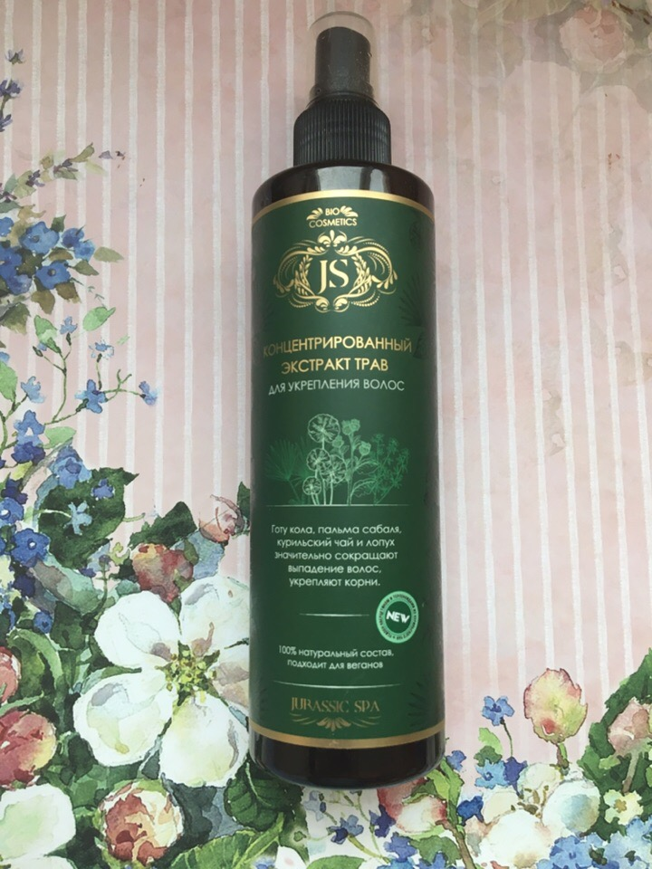Густые и здоровые волосы- залог красоты не только женщин, но и мужчин. К сожалению ,с возрастом качество наших волос портится, им не хватает питательных веществ и обязательно необходима поддержка. Каких только сейчас косметических средств сейчас не встретишь, которые обещают мгновенные результаты, мне в это сложно поверить и поэтому я была в поисках чего-то с натуральным составом, чтобы точно не нанести вред своим волосам. И я его нашла, это оказался "Концентрированный экстракт трав для укрепления волос" от Jurassics Spa Купила я данный спрей в экомагазине, но также как потом увидела можно и заказать на сайте, напрямую от производителя. Объём :270 мл Давайте взглянем, чем же особенно привлекает это средство: лечебная соль - обладает укрепляющим воздействием на волосяные луковицы аминокислоты - ускоряют рост волос, и являются субстратом для построения волос корень лопуха и шишки хмеля- содержат комплекс микроэлементов, которые отвечают за густоту волос, их объём и жизненную силу. Это ли