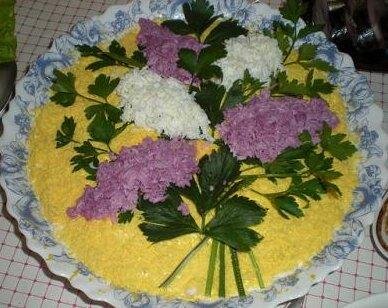 Этот яркий и вкусный салат относится к разряду праздничных блюд, его оригинальное оформление станет украшением любого торжества. Нежная сирень навеет воспоминания о теплых солнечных деньках с буйством ярких красок и прекрасных ароматов. Ингредиенты: курица (филе) – 200 гр. шампиньоны свежие – 200 гр. огурец свежий – 1 шт. сыр – 150 гр. яйцо куриное вареное – 3 шт. чеснок – 1 зубчик майонез – 150 мл. масло растительное – 2 ст. ложки укроп – несколько веточек сок свеклы – 1-2 ч. л. Куриное филе отвариваем до готовности в 1 литре воды с добавлением 0,5 ч. л. соли. Охлаждаем и измельчить ножом на кубики или брусочки. Шампиньоны моем и нарезаем довольно крупными ломтиками. Обжариваем грибы на сковородке с растительным маслом в течение 5 минут, периодически помешивая. В это время нашинкуем репчатый лук. Выкладываем лук в сковородку к шампиньонам, добавляем щепотку соли, немного черного молотого перца, перемешиваем и обжаривем еще в течение 4-5 минут (до мягкости лука). Снимаем с огня и дае