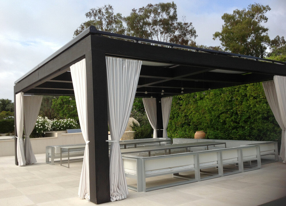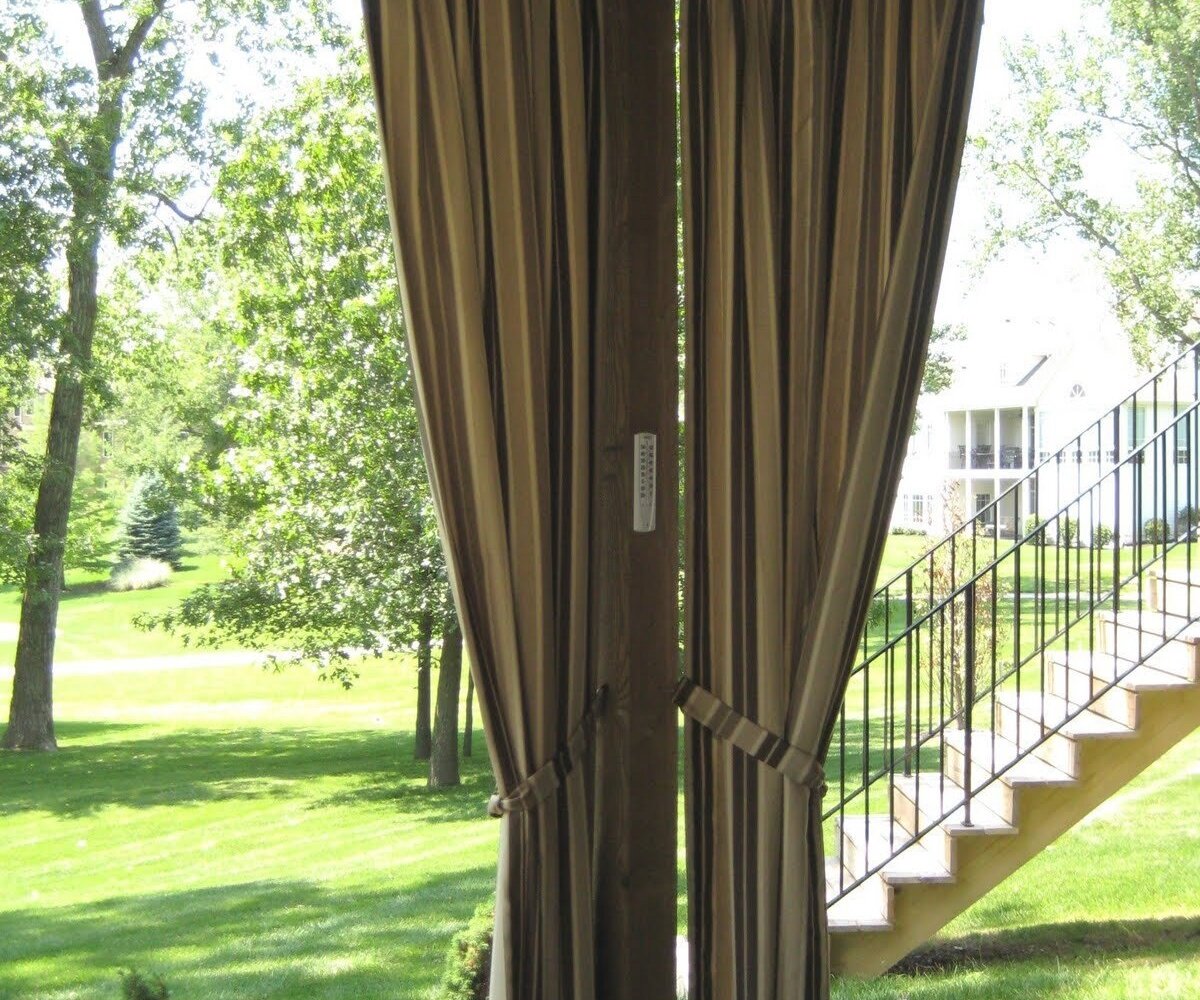 С наступлением тепла, мы все больше времени на природе. Создавая уютное место для отдыха, приятных бесед или веселых компаний владельцы загородных участков все чаще обустраивают уличные беседки и веранды. Оформление их шторами надежно защитит от палящего солнца, насекомых, любопытных глаз и выигрышно украсит самое незамысловатое строение. Ассортимент уличных занавесок очень многообразен, даже при нестандартных размерах проема можно выбрать нужный вариант. Существует несколько вариантов штор, которые используются на верандах и беседках. Тканевые Тканевые занавески – самый распространенный вид, который используется чаще других. В уличных условиях применяют материю из льна, хлопка, тюля, что придает пространству воздушность. Беседки, оформленные такими шторами, сохраняют естественную вентиляцию, обеспечивая комфортные условия для нахождения в ней в жаркую погоду. Дизайн занавесок может быть разнообразным, как простые классические варианты текстиля, так и более сложные конструкции с исполь