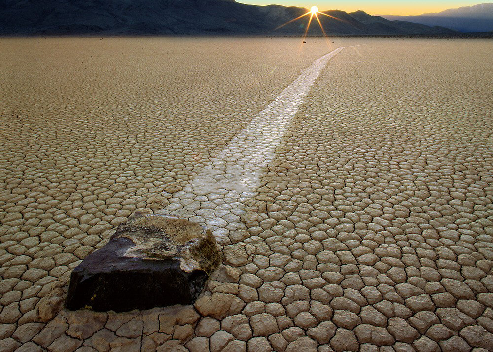 На открытой всем ветрам территории Долины Смерти есть уникальное место, где скалы перемещаются по земле сами по себе. Никто не знает, как они это делают. Одним из подтверждений таких «прогулок» является участок в районе Racetrack Playa, где удивительно ровные «тропы» привлекают внимание ученых и исследователей вот уже не первое десятилетие. Здесь, в 80 километрах от парка Furnace Creek, на дне высохшего озера каждый камень оставляется после себя отшлифованный след. Некоторые из них небольшие - всего 25-30 фунтов, однако размеры большинства превышают 100, а то и 1000 футов в длину. Первые упоминания о необыкновенном явлении можно найти в рассказах Иосифа Крука, золотоискателя из Невады, которым первым обнаружил «гуляющие камни». Это случилось в 1915 году. Затем были многочисленные экспедиции американских геологов в 40-х, 50-х и даже 70-х годах, но разумное объяснение так и не было найдено. Сначала предполагали, что движущиеся камни в Долине Смерти спровоцированы ливнями, которые, захлес