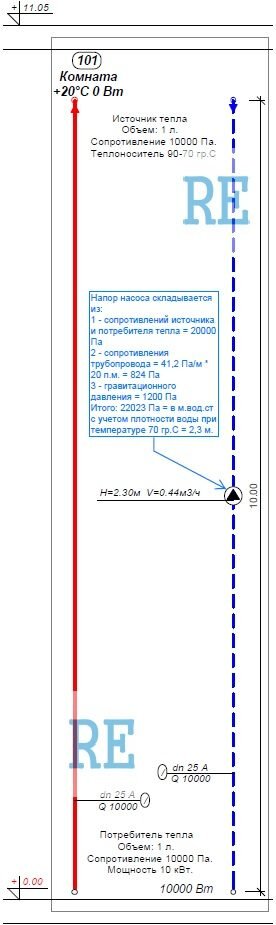 Пример №3 - Простое циркуляционное кольцо с источником тепла сверху Рассмотрим простое, вертикально расположенное циркуляционное кольцо. Источник тепла расположен сверху, потребитель снизу. От условного источника тепла передается 10 кВт. тепла по трубам диаметром 25 мм. В данном примере теплопотери от трубопроводов не учитываются. Программа Auditor C.O. версии 3.8., в данном случае, рассчитывает главное циркуляционное кольцо следующим образом: Напор насоса складывается из: