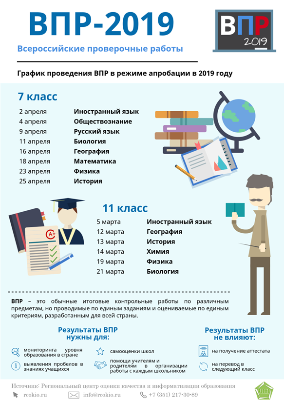 18 апреля в российских школах прошли всероссийские проверочные работы: в седьмых классах – по математике, в одиннадцатых – по химии. ВПР по математике в седьмых классах в 2019 году проводилась впервые, и участие школ в ней являлось добровольным. Работа состоит из 16 заданий, на её выполнение отводится 90 минут. При выполнении работы нельзя пользоваться учебниками, рабочими тетрадями, справочниками, калькулятором. Расписание ВПР может незначительно меняться. В заданиях проверяется овладение понятиями и вычислительными навыками, умение извлекать информацию, представленную в таблицах или на графиках, знание основных единиц измерения длины, площади, объёма, массы, времени, скорости, умение решать текстовые задачи на проценты, решать несложные логические задачи, а также находить пересечение, объединение, подмножество в простейших ситуациях, умение делать оценки и практические расчёты. Проверочная работа по химии для 11-ых классов также проводится по решению школы, она предназначена