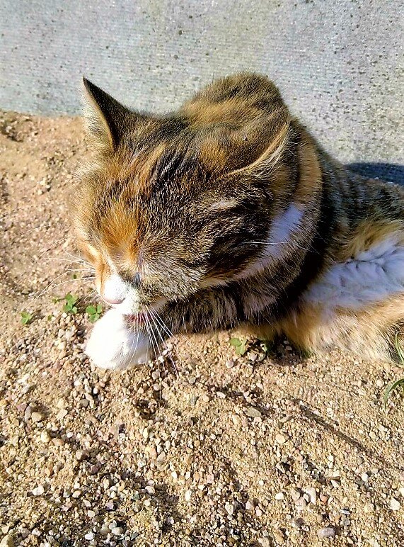 Люся моет мордочку и глаза закрыла. Наверное от удовольствия, и от солнышка.