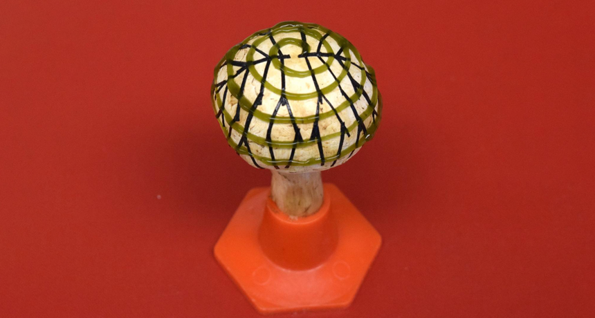 Исследователи нанесли на грибы две "краски". Одна-зеленые чернила, сделанные из цианобактерий. Они использовали это для того чтобы сделать спиральн картину на крышке. Они также использовали черные чернила, сделанные из графена. Графен представляет собой тонкий лист атомов углерода, который отлично проводит электричество. Они напечатали эти чернила в разветвляя картине через верхнюю часть гриба.