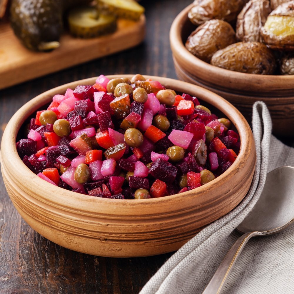 Такой простой и одновременно загадочный винегрет. Как у любого блюда с многовековой историей ,у этого салата самые разные версии появления. По одной из них – родиной вполне может быть одна из скандинавских стран или Германия. Впервые в 1845 году в поваренной книге Англии появляется описание подобного салата из вареных овощей и сельди ( кстати, очень похожего на нашу «селедку под шубой») под названием шведского салата. Но еще в 17 веке моряки и пираты Франции готовили блюдо под названием «Сальмагунди»- по ингредиентам очень схожее с винегретом. Готовилось оно очень незатейливо – жарили мясо ( птица , говядина, то есть любое) или морепродукты , затем мариновали его в вине со специями ,добавляли вареные овощи, зелень , лук и заправляли растительным маслом с уксусом, перцем . Кроме разнообразия морского меню ,это блюдо обеспечивало и профилактику цинги в долгих плаваниях. Конечно, нам больше нравится история появления винегрета, связанная с Петром 1.В те времена к царскому столу вареные