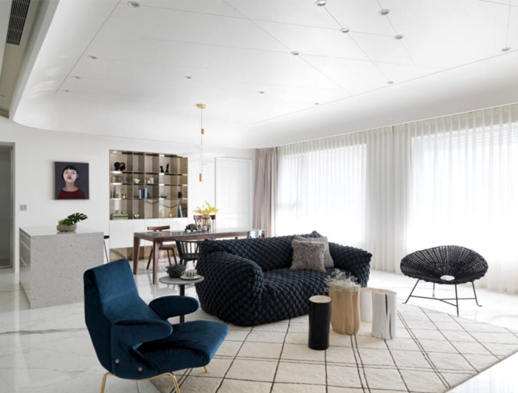 Дизайн проекта в первую очередь направлен на достижение максимального соотношения текстур и баланса между потолком, полом и стеной в общем пространстве: открытой столовой, светлой кухни и гостиной. Потолок в форме чаши покрывает квадратную область, делая всю область интегрированной без границ. Перевернутая вверх дном часть чаши может увеличить высоту потолка и создать дугу, соединяющую фасад из круга, представляя красивую и обширную дугу. Кроме того, дизайн разделительной линии на потолке направлен не только на то, чтобы придать потолку некоторую подвижность. Положение пересечения разделительной линии - это то, что пользователи используют чаще всего. Таким образом, позиция пересечения обоснованно стала источником света на потолке и была представлена логической линией. Что касается пола, тонкий сланец используется для развития от горизонтального измерения к вертикальному измерению, которое служит телевизионной стеной. Помимо добавления трехмерной концепции, этот метод