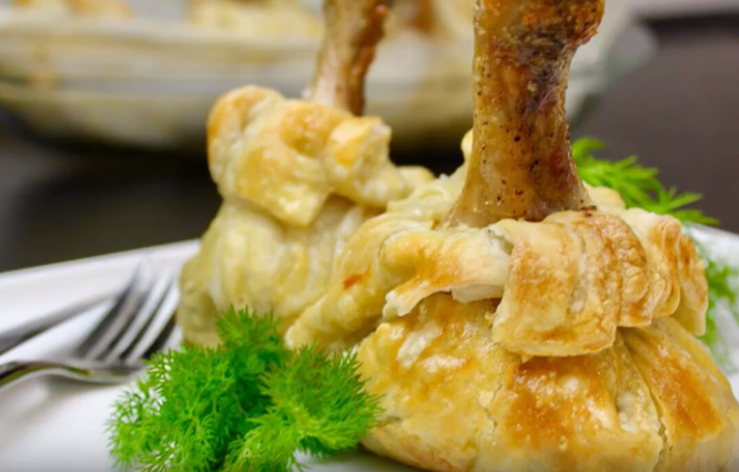 Вкусная и оригинальная подача куриных ножек. Минимум ингредиентов - максимум вкуса. Гости, наверняка, оценят. Готовим... Продукты: Ножки куриные - 7 штук Тесто слоеное - 500 грамм Шампиньоны - 800 грамм Лук - 2 штуки Соль, перец Яйцо - 1 штука для смазки теста Куриные ножки солить и перчить, добавить любимые приправы. Далее, обжарить на сковороде до готовности. Шампиньоны нарезать, обжарить на сковороде, посолить. Далее, добавить к грибам нарезанный лук. Протушить до готовности. Тесто раскатать. Разрезать на 7 квадратов. В каждый из которых выложить луково - грибную начинку. Сверху "поставить" куриную ножку. Поднять края теста к верху, сформировав тем самым мешочек. Косточка ножки должна торчать. Завязать мешочки при помощи "веревочек" из слоеного теста. Поместить куриные ножки в мешочках в форму для выпечки. Форму застелить пергаментом и немного присыпать мукой. Тесто смазать взбитым яйцом. Готовить 30 минут в уже разогретой до 180 градусов духовке. Приятного аппетита! Удивляйте и р