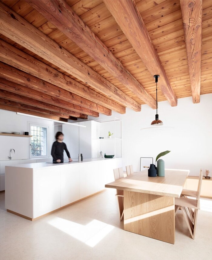 Дизайн-проект интерьера Didonè Comacchio Architects (дизайн-агенство) для реставрации загородного дома в венецианской деревне, построенного в начале 1900-х годов. В интерьере задействованы природные материалы: балки из лиственницы и каменные или кирпичные фактурные стены. Дизайнеры использовали простые, но элегантные геометрические фигуры, которые выполнены в бежевых тонах. Коридор отделяет гостиную от кухни. Также по деревянной лестнице из этого коридора можно попасть в спальную зону на втором этаже здания. Цвета и материалы, используемые для новых элементов, сокращены до необходимого словарного запаса и специально разработаны, чтобы сделать пространство ярким. Поверхность тротуарной плитки, проходящая через весь первый этаж, выполнена из полированного восточного камня и становится нейтральной основой, на которую вставляются различные элементы мебели. Обеденная / кухонная зона характеризуется большой белой кухней и цельным дубовым столом, последний также используется для к