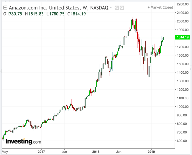 Сегодня речь пойдет про крупнейшую в мире компанию электронной коммерции Amazon.com. Несмотря на некоторые негативные мнения экспертов и аналитиков, в текущем 2019 году акции ее продолжили свое восходящее движение даже вопреки прогнозам о коррекции и перекупленности. Мощными драйверами для роста стоимости акций вопреки всему являются конкурентная сила компании и самые разнообразные источники дохода. Акции компании торгуются на уровне в 1814,19 долларов. С начала текущего года их роста составил уже на 23%. Если сравнить, что за прошлый год рост составил 25%, то пока что перспективы очень даже вдохновляют. На недельном графике отчетливо видно, что за последний месяц наблюдается сильный импульс для роста. И его формирование лишний раз доказывает нам, что в краткосрочной перспективе никаких преград для остановки роста стоимости акций мы не наблюдаем. За последние пять столь мощное ралли по-прежнему не прекращается. Текущий рост и так уже составил 430%! Но столь стремительный рост акций