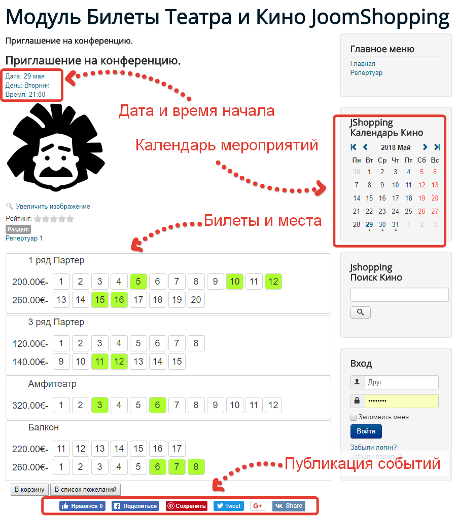 В целом пользование сайтом при покупке билетов для посетителя сайта мало чем отличается от обычного магазина на Joomshopping, за исключением что каждый продукт теперь имеет дату показа. А само событие(представление) имеет много кнопок(мест) под описанием показа события аккуратно сгруппированных по рядам и по ценам. Посетитель сайта интуитивно легко выберет нужное(ые) место(а) в зале, оформит покупку и сделает оплату.