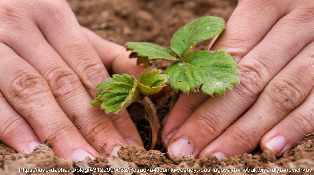 Под высадку маленьких клубничных кустиков рекомендуется делать лунки, глубина которых семь — десять сантиметров. При высадке растений, старайтесь как можно лучше и аккуратнее расправить все корешки, а затем присыпать землей.