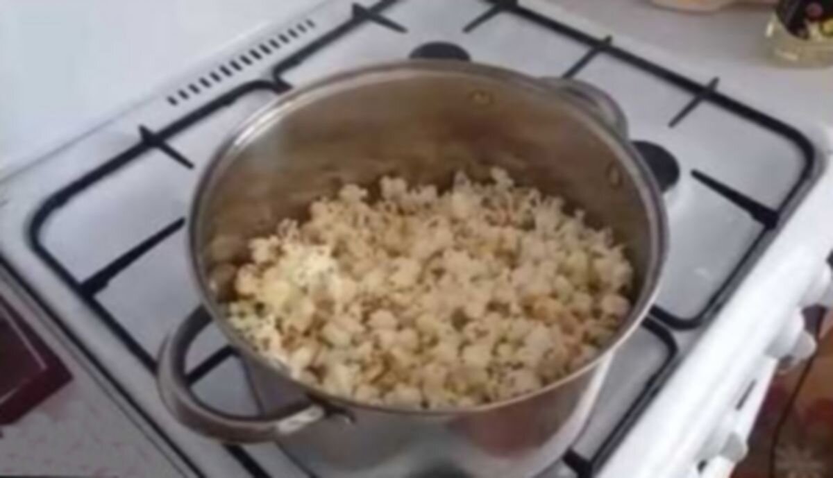 Когда зернышко лопнет - масло нагрелось. Всыпать остальные зерна, накрыть кастрюлю крышкой и держать на огне постоянно потряхивая кастрюлю. Зерна будут хлопать - лопаться. Возможно не сразу начнут, ведь много зерен остудят масло, и до первых хлопков нужно подождать минуту - другую.