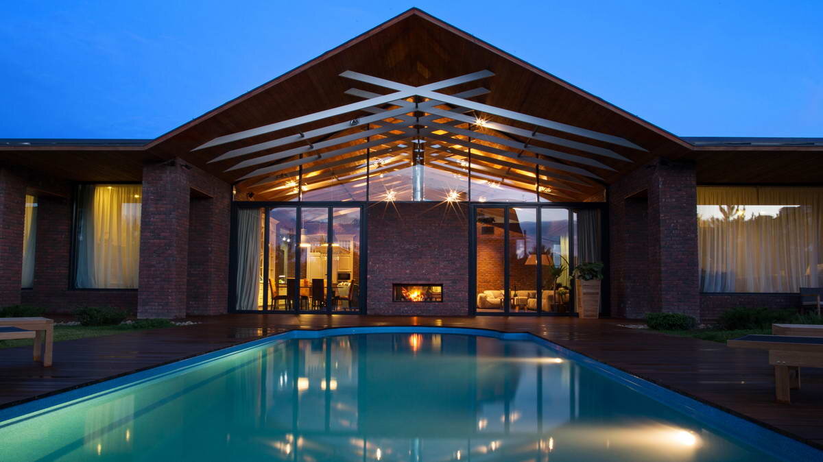 Отдельного внимания заслуживает каминная зона – основное требование владельцев участка. Двусторонний камин стал самым оригинальным и непростым решением для архитекторов студии «Чадо». Идея возникла из желания рационально использовать эту зону: так, камин интегрировали в стену, выходящую на террасу с бассейном. Камин в этом доме — это отдельно стоящая топка, обложенная кирпичом. Ниши под дрова – это настоящие поленницы. По бокам от камина установили большие витражи: когда на улице тепло, их можно полностью раздвинуть и границы между домом и его окружением почти полностью сотрутся.