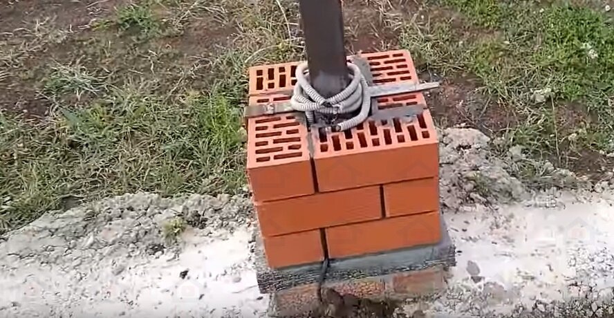 Первым этапом произведена выборка канавы барой на 70 см. Столбы вбивались на 1,2 м. Все столбы связаны арматурой в 4 линии – 2 сверху, 2 снизу. В итоге вся конструкция заливалась бетоном. Для столбов применена профильная труба 50х50. Возле ворот и калитки, конструкция усилена трубой 80х80. Участок с уклоном, поэтому по всей линии отбивается уровень. На самой высокой точке кладется цокольный кирпич. От общей горизонтальной линии на все столбы переносится уровень цокольной кладки. Таким образом, все столбы будут на одной высоте. Между цокольным кирпичом и облицовочным прокладывается гидроизолирующая мембрана. После первых трех радов привариваются первые закладные для поперечин забора, рамы калитки и ворот. Всего будет три уровня. Чтобы столбы не были развернуты, натягивается нитка по всей длине по крайним углам. На месте калитки в столб запущен кабель под звонок. Расшивка производится с помощью металлического прута. С одного края заподлицо укладывается прут. Наносится раствор ч