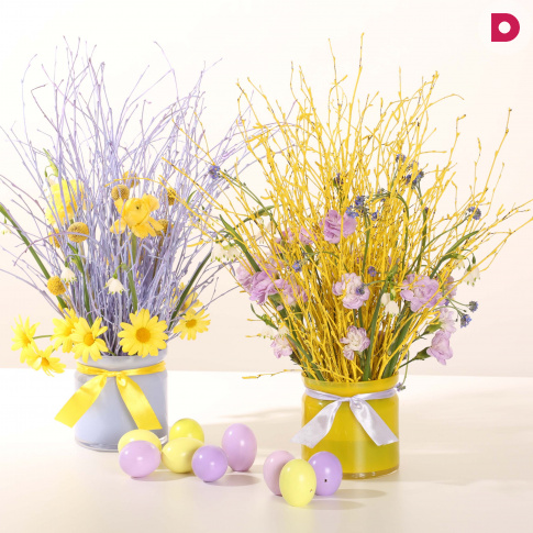 садовый нож. Шаг 1 Заранее окрашиваем ветки и стеклянные банки в два цвета: нежно-лиловый и желтый. Банки окрашиваем изнутри, краску наносим в два слоя. Даем краске хорошенько высохнуть. Шаг 2 На получившиеся вазы повязываем атласные ленты. На сиреневую – желтую ленту, а на желтую вазу – сиреневую. Шаг 3 Ставим окрашенные ветки в готовые вазы, предварительно перевязываем у основания ветки бечевкой. Шаг 4