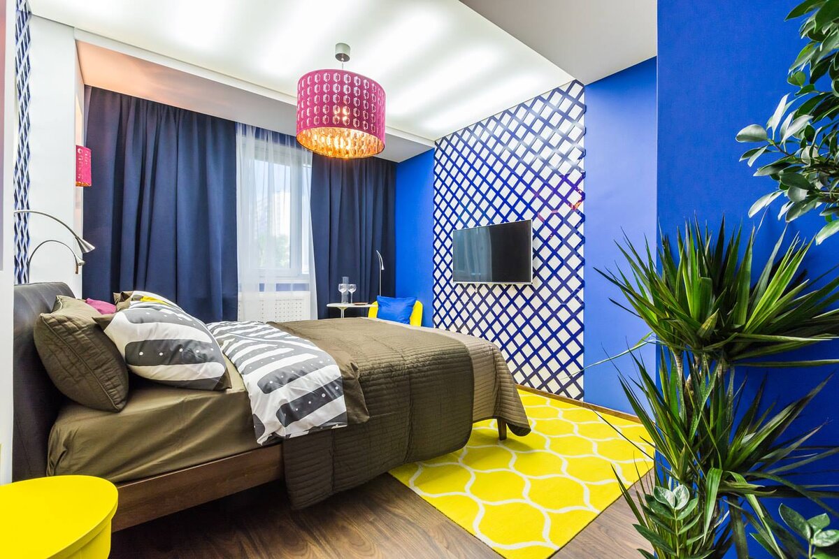 Например, глубокий синий цвет стен не будет раздражать, но действовать расслабляющие. Кому-то он напомнит сумрачный летний вечер, когда солнце уже скрылось за горизонтом, но отражение его лучей еще подсвечивает небосвод, а у кого-то вызовет ассоциации с бездной морских глубин… Раскидаем контрастные желтые подушки, а фотографии поставим в такие же желтые рамки. Уравновесит такие смелые сочетания др