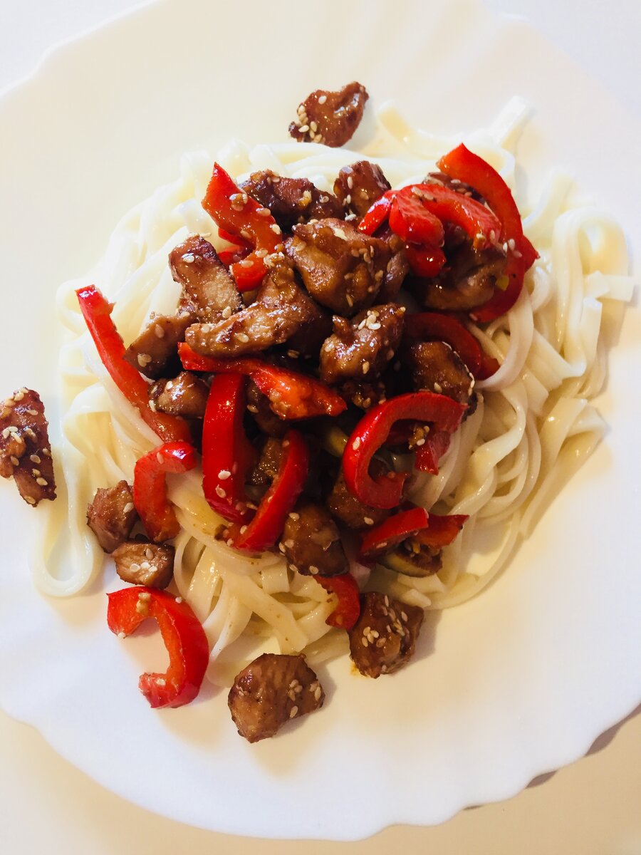 Пшеничная лапша со свининой по китайски Ингредиенты на 4 порции: 1. 500 гр свинины 2. Пшеничная лапша 3. 1 болгарский перец 4. Кунжут Для маринада: 1. Соевый соус 2. Устричный соус 3. Кунжутное масло 4. 1 зубчик чеснока 5. 1 ч. ложка сахара Для начала нужно приготовить маринад. Для этого необходимо смешать соевый соус, устричный соус, кунжутное масло, через чеснокодавку выдавить чеснок и добавить сахар. Свинину промыть и очистить от жилок, нарезать на небольшие кусочки и замариновать. Чем дольше она будет мариноваться, тем насыщеннее будет вкус. Тем временем нужно отварить пшеничную лапшу по инструкции. Я отваривала ровно 11 минут. Когда мясо будет хорошо промариновано его необходимо пожарить на сковороде Wok не менее 10 минут без добавления масла, так как в маринаде уже содержится очень вкусное и насыщенное кунжутное масло. За 3 минуты до готовности добавляем нарезанный вдоль и тонко красный болгарский перец и жарим вместе с мясом. Пока наше мясо доходит до готовности, обжарить на