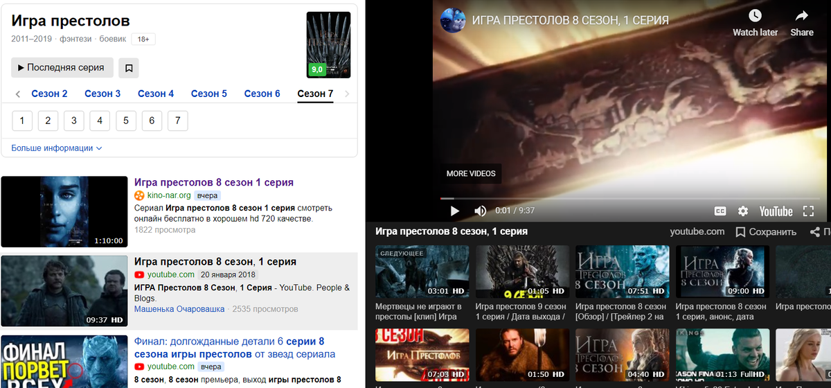 Если вы еще не знаете, где будете наслаждаться финалом сериала "Game of thrones" о драконах, Железном троне и Короле ночи - даю подсказки как это можно сделать. Для сравнения привожу еще несколько проверенных способов увидеть битву живых и мертвых, но самые бесплатные - смотрите в конце списка, оставила их на десерт 😊 Рен ТВ (бесплатно) Ну, этот вариант скорее для тех, кому пофиг на Железный трон, Вестерос и драконов. Если подождать полгода-год, есть вероятность, что РЕН ТВ покажет 8 сезон с официальным дубляжом в вечернем эфире. Яндекс.Видео (бесплатно) Самый общедоступный способ: с помощью сервиса, агрегирующего видео, найти любой сайт, который будет транслировать нам сериал с 2-7-дневной задержкой. Сезоны 1-7 можно найти на Яндекс.Видео на любом языке (русский, английский, украинский итп) и в любом варианте озвучки - официальный от амедиатеки, от lostfilm, alexfilm, novafilm, onefilm. Не люблю пиратство, но при конских ценах на все и широком выборе тех же переводов, которые