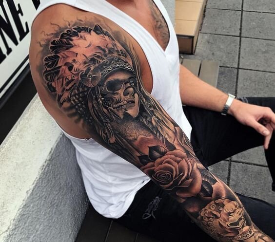Татуировка с первым обитателем Северной Америки символизирует почитание традиций и уважение к предкам. Обладатели такого нательного рисунка придерживаются идеологии о том, что наука и технологии разрушают связь человека со своим природным началом и духовностью. Индеец, как древний житель, олицетворяет могущество, способность самостоятельно справляться с жизненными трудностями и взаимодействовать со стихиями Вселенной.