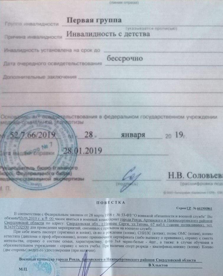 История пришла к нам из поселка Верхние Серги. 19-летний местный житель по имени Максим имеет инвалидность первой группы и еле передвигается. Год назад он проходил медкомиссию и был признан негодным, однако, врач ошибся и написал, что он годен. В итоге спустя год его обязали явиться в военкомат, чтобы отправиться на службу. Мама Максима заявила, что из-за этой ошибки ее сына отправляют на обследование в город Первоуральск, но туда ему добраться очень сложно.