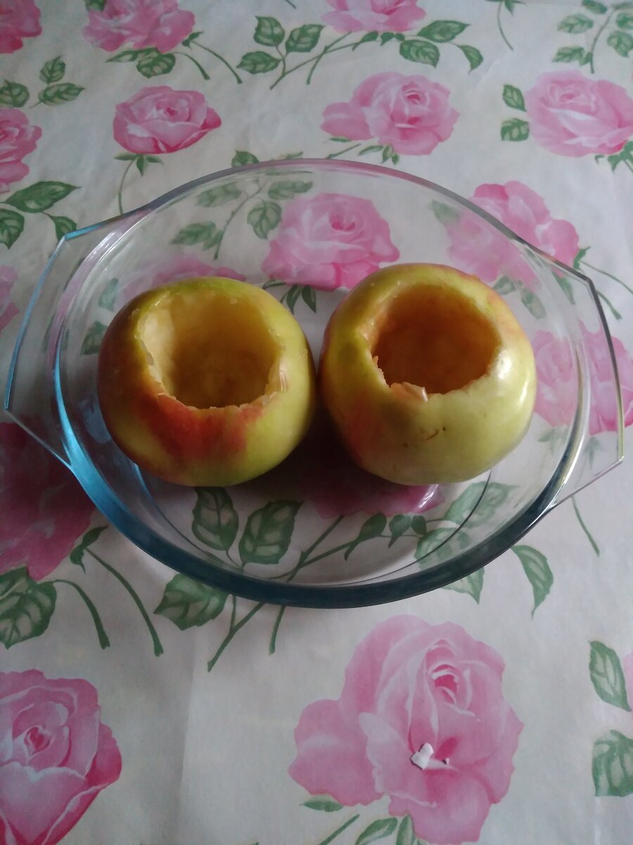 Яблоки моем и аккуратно, сначала ножом, а потом маленькой ложкой, вынимаем серединку с косточками. Донышко у яблочков оставляем. Ставлю яблочки в форму для микроволновки.