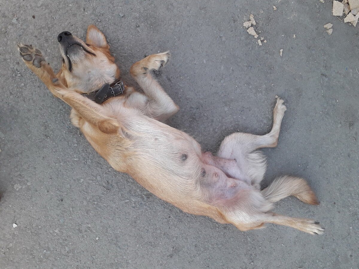 Истощенная рыжая собака пришла накануне во двор жилой многоэтажки в Тракторозаводском районе. Дворняга аккуратно подошла к людям и пыталась ласкаться, демонстрируя свой добродушный нрав. В какой-то из моментов «рыжуля» улеглась на спину и тогда жители заметили, что собака – кормящая мать.