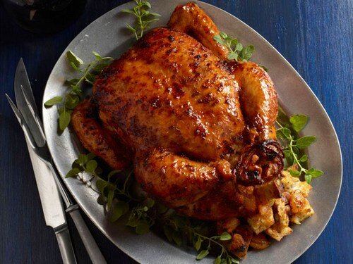 Метод: 1)Нагрейте духовку до 200C / 180C . В маленькой миске разотрите масло с одной третью листьев тимьяна, пюре из чеснока и соком половины лимона. Смешайте все вместе с приправой и отложите. 2)Используйте свою руку, чтобы освободить куриную кожу от груди, затем протолкните большую часть масляной смеси в щель. Натрите оставшееся масло по всей внешней поверхности курицы, затем наполните полость половинками лимона, оставшимися листьями и стеблями тимьяна и чесноком. 3) Разложите измельченную морковь, лук и лавровый лист над основанием маленькой жаровни. Сядьте курицу сверху, грудкой вверх и запекайте на средней полке в тече