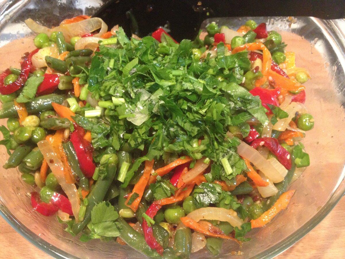 К этому рецепту меня сподвигла безумная любовь к жареным овощам. Я всегда покупала готовые замороженные смеси, но к сожалению ни всем членам моей семьи угодишь с составом ( кто-то , что-то обязательно не ест). И тогда я решила сама подобрать "набор" овощей, чтобы все были довольны. Рецепт на самом деле ОЧЕНЬ простой! И смысл его в том, что смесь овощей получается именно ЖАРЕННОЙ , а не тушёной, варёной и т.д. Для приготовления блюда нам понадобится: перец сладкий - 1 шт. ( крупный), морковь - 2 шт. (среднего размера), лук - 3 шт. ( среднего размера), чеснок - 3 дольки, фасоль стручковая сухой заморозки - 400 гр., горох зелёный сухой заморозки - 300 гр., зелень петрушки, масло подсолнечное ( оливковое) - для обжарки , кунжутная смесь - 1 ст. ложка ( не обязательно) Шаг 1. Подготавливаем овощи : чистим лук, морковь, чеснок, из перца удаляем семена . Шаг 2. Овощи тщательно моем и нарезаем. Лук - полукол
