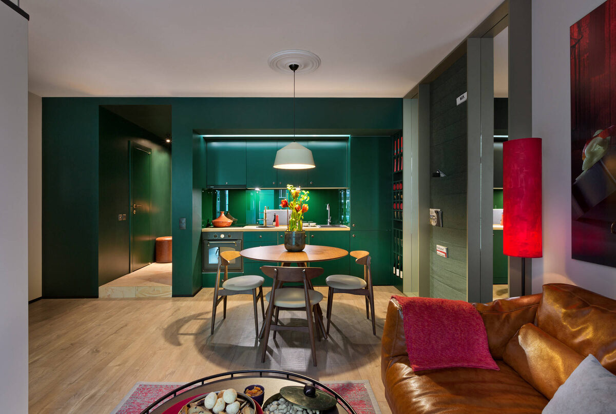 Студия Fateeva Design представила проект компактных апартаментов площадью 40 квадртаных метров в Киеве, Украина. Логика интерьера этой квартиры подчинена стилю жизни одного человека, а значит – минимум компромиссов, максимум самовыражения заказчика. Чистый, конструктивный характер пространства сформирован ясной планировкой, лаконичным набором материалов, обилием светлых поверхностей и локальным объёмом насыщенно-изумрудного оттенка. Ярко выраженный цветовой акцент – стилистический код этого проекта, главный фактор идентичности. Ещё одним значимым стилеобразующим элементом пространства стал блок спальни. Реализация полноценной комнаты для отдыха стала возможной после присоединения лоджии к жилой площади. Архитектурный объём предельно облегчён и почти не закрывает доступ естественного света в квартиру: стены конструкции остеклены по верхнему периметру, вход снабжён раздвижной дверью, а в оформлении преобладает очень светлый серо-песочный оттенок. Источник Источник