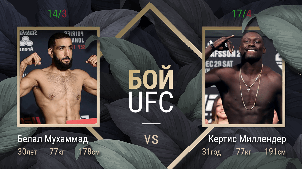 Одними из первых в октагон на UFC 236 выйдут два представителя легкого веса – Мухаммад и Миллендер. Кто из них выйдет с этой схватки победителем? Если верить букмекерским конторам, с триумфом клетку должен покинуть Белал. Однако хватит ли ему сил и сноровки, чтобы одолеть более рослого соотечественника? Где и когда? Схватка начнется в американской Атланте пятнадцатого апреля приблизительно в 2:30 по МСК. Она станет одним из поединков первого предварительного карда. Сравнение соперников Контракт тридцатилетнего Мухаммада длится с промоушеном UFC третий год. Под его флагами американец провел восемь боев. Три из них он проиграл. Несмотря на умение отрабатывать в стойке, Белала крайне сложно назвать страйкером или нокаутером. Да, он отлично выдерживает напор оппонентов в стойке. Но при этом Мухаммад крайне редко завершает свои поединки досрочно. Миллендер четыре раза выступал под эгидой UFC. Также у тридцатиоднолетнего американца на порядок больше схваток в целом за карьеру, чем у его гр