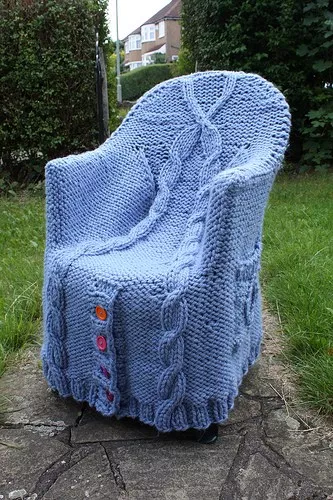 Правильный ответ — легко, если вы умеете вязать! Из пластиковых стульев при небольшом старании получаются очень уютные, непохожие ни на что другое вязаные кресла. И главное — их дизайн определяете вы и только вы! Вязать чехлы на пластиковые стулья лучше (но вовсе не обязательно) толстыми нитками: чем толще нить — тем быстрей будет продвигаться работа. А дальше... дальше вы даёте волю собственной фантазии. Обычное лицевое вязание из остатков разноцветной пряжи, простые или ленивые жаккарды, араны, теневые узоры, простая или цветная резинка — вы вправе делать со своим стулом всё, что захотите. Разве что ажуры будут несколько не в тему, но кто сказал, что их нельзя посадить на красиво сшитый чехол? Есть несколько правил обвязки стульев и кресел: 1) сначала тщательно обмерьте ваш будущий шедевр и обязательно свяжите образец. Некоторые рукодельницы советуют сделать выкройки всех частей будущего кресла и прикладывать вязание к выкройке. Но можно просто вязать по снятым меркам (разумеется,