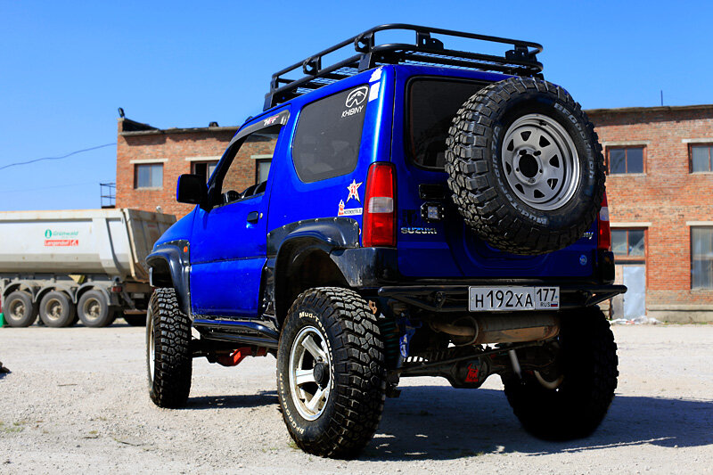 Передние-то давно делал, они человечеству нужнее. Вернее, их отсутствие при лифте подвески куда заметнее - руль начинает жить своей жизнью. А сделать задние сподвиг стеклопластиковый обвес, реплика японского CarStyle, которую изготавливает ателье HFT в Находке. Японцы, странным образом, делая широкие передние арки под большие колёса, напрочь игнорируют тот факт, что сзади будут такие же катки. В итоге, если не задрать кузов куда-то в космос, ничего не влезет. Поэтому разработал задние рычаги, отодвигающие мост на 20 мм с небольшой компенсацией (иначе говоря, доворотом) этого сдвига. Теперь 32"-33" колёса засунуть в Джимни несколько проще.