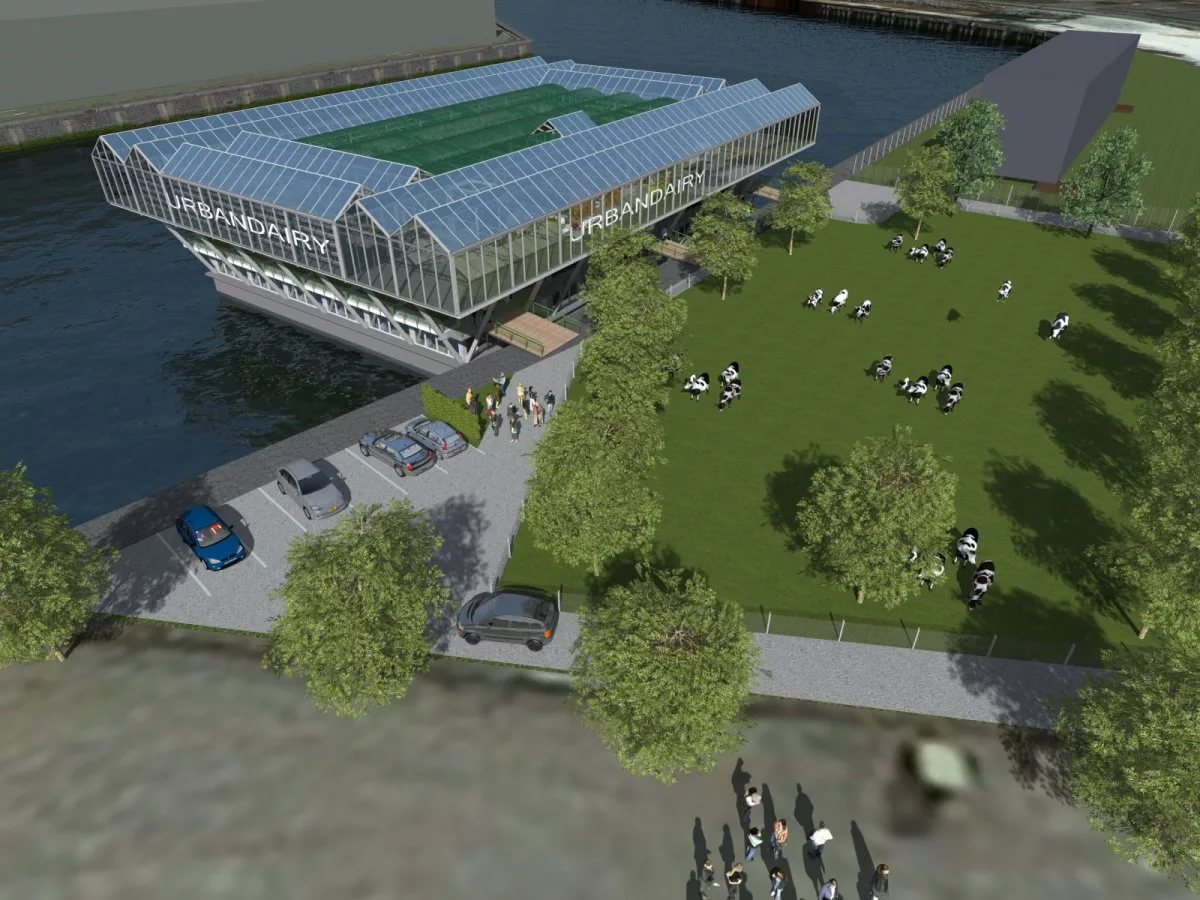 «Здание уже готово, мы сейчас устанавливаем и тестируем машины, и через четыре недели появятся коровы», - говорит Питер Беладон, разработчик фермы. Плавучая ферма планирует перерабатывать отходы коров, выращивать траву, производить молоко и йогурт, собирать дождевую воду и использовать собственную солнечную энергию.