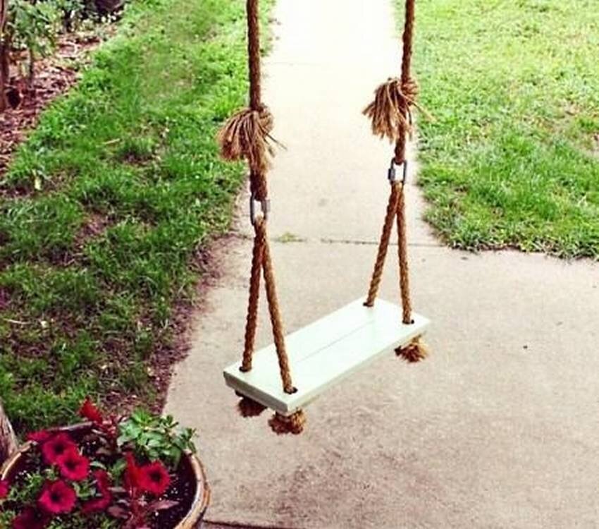 Что такое качели – это возможность летать для того, кто летать не может. Качели вызывают восторг не только у детей, но их обожают многие взрослые. Простые качели можно повесить на дачном участке. Достаточно иметь крепкий сук, верёвку и материал для сиденья. Для этих простеньких качелей используется дощечка с отверстиями в которые продета верёвка и завязана с обратной стороны большими узлами. А такие качели сделаны из прорезининой ткани и прочно прикрепленных к ней цепочкам. Не просто дерево, а деревянная конструкция. Всё продумано в надёжном креплении и в дизайне сиденья. Самые маленькие тоже хотят качаться. Для них безопасная конструкция с ограждением со всех сторон и тряпичным сиденьем. Шины так же идут в ход. Вот такая милая тарзанка получилась. Оплетённый круг с паутинкой внутри, образует гнездо, в котором можно покататься как сидя так и лёжа. Зона релакса для взрослых. Подвеснаякачель из поддонов с выемкой для пивных бутылок. Милое кресло-гамак. Пару подушек делает его уютным. В
