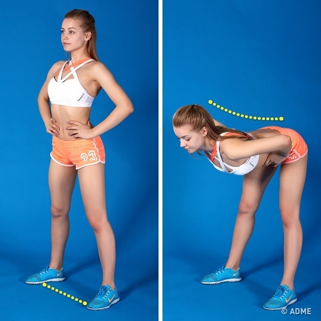 - Теперь наклоняйтесь вниз, не забывая про осанку.