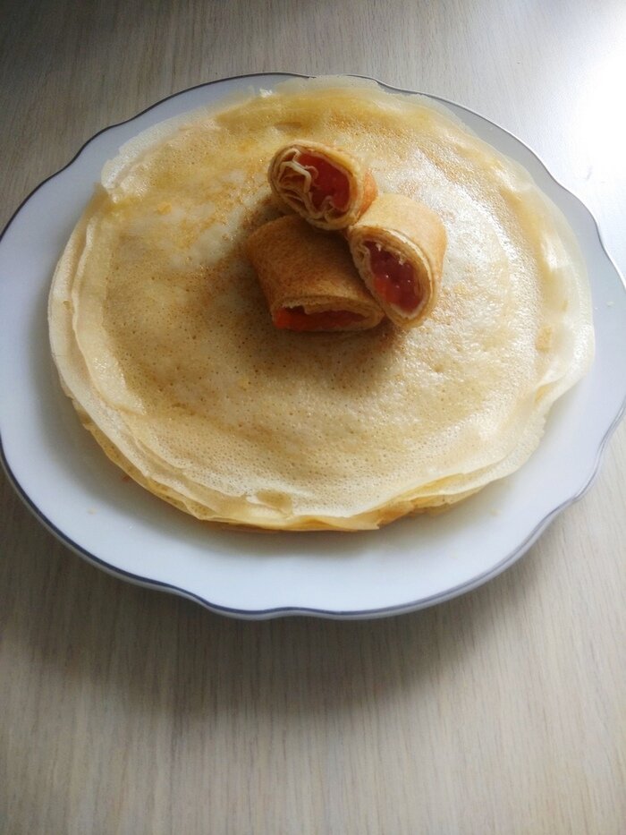 Мне кажется, нет таких людей, которые не любят тонкие блинчики! Ведь это не только великолепный десерт, но и основа для множества блюд. В них можно завернуть как соленую, так и сладкую начинку. Например, из творога и изюма, икры, яиц и зеленого лука, обжаренного фарша или ливера и т. д. Вариантов масса, стоит только освоить совсем не сложный рецепт тонких блинчиков! Ингредиенты: Приготовление 1. Молоко следует подогреть до теплого состояния и поместить в глубокую миску. 2. Добавить в жидкость куриные яйца. 3. Отправить туда же сахарный песок и немного соли. 4. Взбить венчиком до однородного состояния. 5. Постепенно вмешать муку, тщательно перемешивая, чтобы не было комочков. Консистенция теста должна быть жидкой. Примерно, как у жирных сливок. 6. Добавить растительное масло и снова перемешать. Оставить блинное тесто на 10 минут. 7. Тем временем сковороду с толстым дном (желательно специальную блинную) необходимо смазать растительным маслом и раскалить на плите. Убавить огонь. 8. Тепе