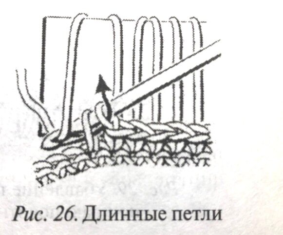 Выполняют по лицевой стороне полотна. Набросьте нить на большой палец левой руки, образуя петлю. Затем расположите крючок по верху нити, введите его в петлю столбика предыдущего ряда и провяжите столбик без накида. При вязании в двух направлениях изнаночные ряды вяжут обычными столбиками без накида или с накидом. Можно выполнять длинные петли с помощью узкой полоски плотного материала, например картона. Преимуществом этого способа является то, что после извлечения полоски все петли получаются одинаково длинными, чего труднее добиться при вязании с помощью пальца.