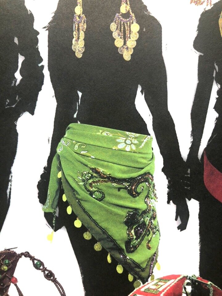 Продвинутый пояс-косынка, подходящий для дискотек и вечеринок, можно изготовить всего за пару вечеров; идеально для тех, кто занимается восточными танцами. То, каким получится готовое изделие, полностью зависит от фантазии мастерицы и того, какие материалы имеются в ее распоряжении. Представленный в этой статье восточный платок своими руками сделан из зеленовато-коричневого капронового платка и украшен пайетками светло-зеленого, оранжевого, буро-зеленого и фиолетового цветов, однако цветовая гамма изделия может быть любой — здесь все зависит от того, какой платок вы используете для создания этого оригинального аксессуара. Материалы: Прежде всего разошьем блестками необычный пояс. Украсим только один угол восточного платка, обшив пайетками нарисованный на нем узор. Для того чтобы работа шла быстрее и выглядела аккуратно, будем обшивать контуры нанизанными на нитку пайетками, а маленькие детали украшать отдельными блестками, закрепляя их тамбурным швом. После того как уго