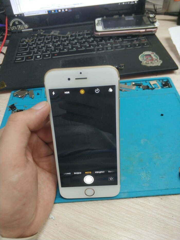 За помощью ко мне обратился многоуважаемый пикабчянин @primorets. С его слов, аппарат уронили плашмя на твердую поверхность и камеры стали косплеить квадрат Малевича, а именно ничего ни одна ни вторая не показывает. Выглядит это так: На фронталку даже переключаться не хочет, а включив FaceTime - все тоже самое. Вывод - обе камеры не работают. Разбираем аппарат (телефон ориг, я у него был первым и старался быть нежным с ним, чтобы не испортить впечатления). Для начала подкинул другие камеры - не прокатило. При "прощупывании" разъема основной камеры мультиметром - я увидел отсутствие напряжения. Напряжение на схеме обозначено как "PP2V85_RCAM_AVDD_CONN" Ну и тогда начал отклеивать адгизивку вокруг коннекторов и очень внимательно смотреть.