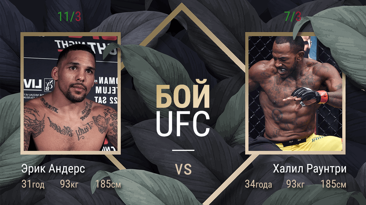 Одной из схваток основного карда UFC 236 станет противостояние двух нокаутеров. Кто же из них выйдет из клетки со всеми почестями: Андерс или Раунтри? Согласно котировкам российских БК, чуть больше шансов на успех имеет Эрик. Но так ли он серьезно превосходит Халила? Где и когда? Поединок, в котором Андерс встретится с Раунтри, начнется в Атланте (Соединенные Штаты), четырнадцатого апреля, поздним вечером. То есть по московскому времени бой следует ждать приблизительно в шесть часов утра понедельника, пятнадцатого апреля. Сравнение соперников На счету тридцатиоднолетнего Эрика Андерса шесть схваток в организации UFC. В 2017-м он выступил неплохо, а вот прошлый год провалил – только одна виктория после четырех проведенных боев. Всего за свою карьеру профи американец оказывался в восьмиугольнике четырнадцать раз. На его счету одиннадцать побед (восемь досрочных) и только три провала. Чуть более опытный тридцатичетырехлетний Раунтри тоже провел в UFC шесть боев. И победу американец праз