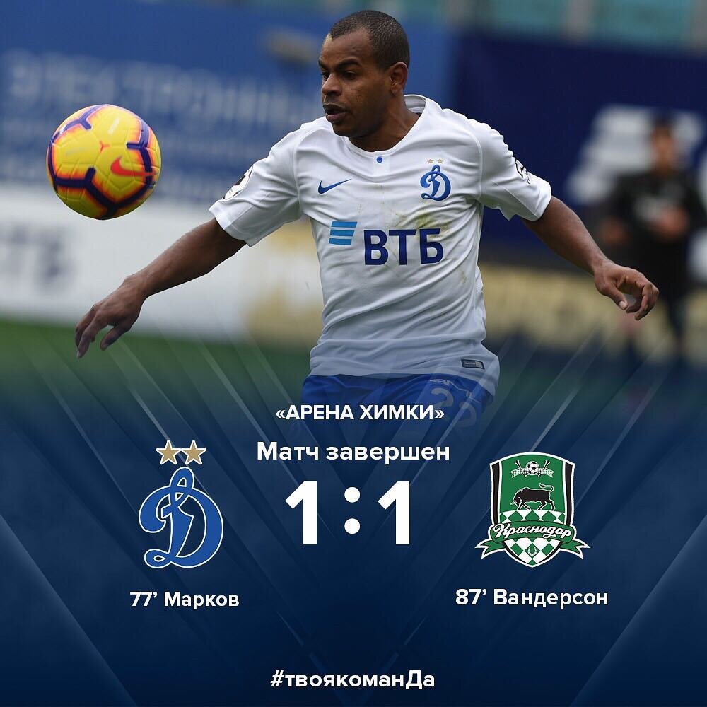 В этом матче было забито не так много голов, как хотелось бы. Счет на конец матча - 1:1. Голами отличились Евгений Марков(DYN) и Масьель Вандерсон(KRA). -Евгений Марков отправил мяч головой в нижний угол ворот после навеса с углового. -А Вандерсон буквально впихнул мяч в ворота после отскока. Также активными действиями отличились: Луценко Е.(DYN), Соу С.(DYN) и Каборе Ш.(KRA). Они получили желтые карточки. А на замены вышли: Грулев В.(DYN), Хульмен С.(DYN), Игнатьев И.(KRA), Уткин Д.(KRA) и Рамирес К.(KRA).