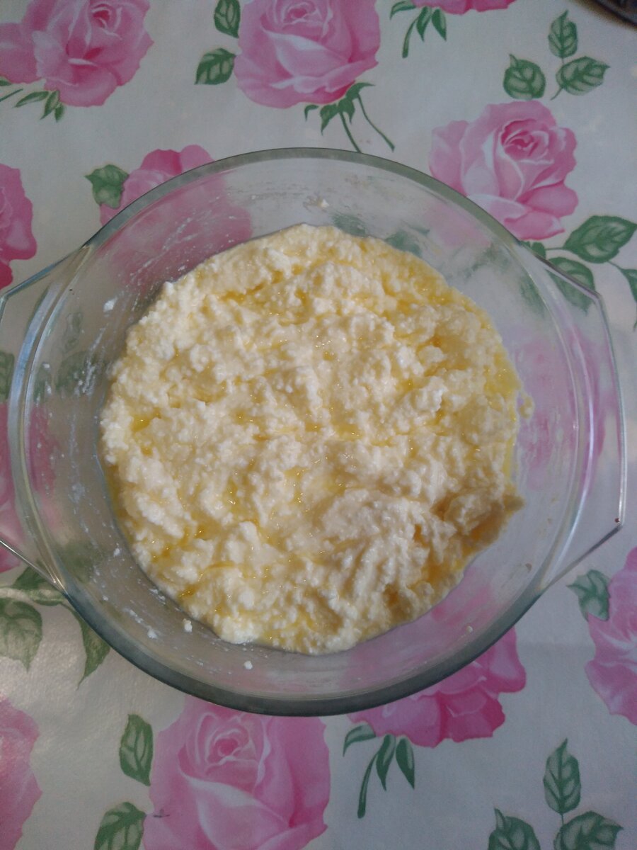 Творог выкладываю в форму (не обязательно его перетирать до гладкой массы, творожные крупинки не испортят вид и вкус хлеба), добавляю яйца и перемешиваю до однородности.