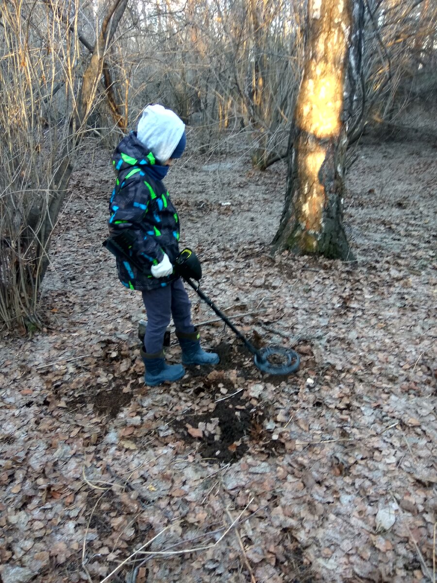 Всем читателям - пламенный привет с морозного Урала. Сегодня хоть и солнце весь день светило, но температура выше +5 не поднималась. Все выходные пролетели в домашних хлопотах да поездках. На коп удалось выбраться только к вечеру воскресенья, зато вместе с сыном. Пока у него не очень получается отыскивать цели в выкопанной кучке земли, но зато он удачливый. :) Первая монетка сегодня была его. И не важно, что это были 10 рублей ходячки. Находки ведь очень сильно зависят от места поиска, а мы ездили не на урочище. Кстати, металлоискатель у сына - MD-3030. С фотографиями только вот опять проблема - телефон всё больше подводить стал. Из десятка сделанных фото сохранилось только 2, так что опишу находки словами. Место выбрали довольно мусорное, поэтому много проволоки и фольги было, ржавый напильник, аккумулятор 18650, какая-то решётка на петле, ну и банку прибрал - всё мусору в лесу меньше будет. По "кругляшкам" - одна пуговичка, две ходячки и 2 советика. В багажник поставил тазик для шм