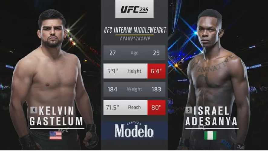 13 апреля 2019 года на турнире UFC 236 прошёл бой "Келвин Гастелум vs. Исраэль Адесанья". На самом деле, я немного недоволен боем. Я ожидал от Гастелума большего. Нигериец же, напротив показал себя с лучшей стороны. Снова. Когда я увидел анонс этого боя, я подумал: "Ну что ж, вот и закончилась удача Исраэля". Я был уверен, что Келвин, где-то в втором - третьем раунде, "кинет дурака" и адесанья отправится на маты, где после добивания его можно будет уносить.Гастелум, - думал я, - по-настоящему крепкий боец для среднего веса. Уж кто-кто, а он сможет терпеть хайкики кикбоксёра Адесаньи, давить его в стойке и держать удар. Это, собственно, он и показал, во втором раунде, после локтя с разворота, когда на таймере оставалось 49 секунд. Упал и сразу встал, да ещё и накидал вдогонку. До середины второго раунда, Гастелум показывал полную доминацию в стойке. Рослый Адесанья, несмотря на свои руки, не мог банально дотянуться до бойца из США. Во втором раунде Адесанья понял, что пора бы и побежда
