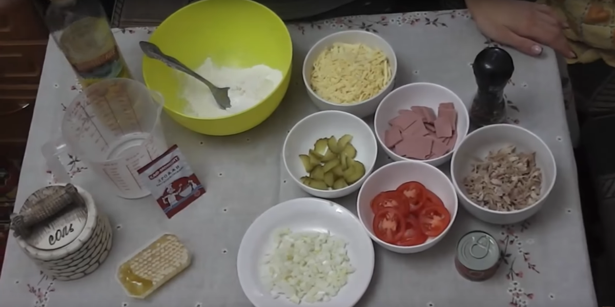 Всем привет сейчас я расскажу о том, как быстро приготовить очень вкусную пиццу, а самое главное легко. Всё, что нам понадобиться, находиться на столе. Сначала мы замешиваем тесто, высыпаем чайную ложку дрожжей, добавляем пол стакана тёплой воды и перемешиваем. Туда же добавляем пол столовой ложки мёда. Затем добавляем щепотку соли и столовую ложку растительного масла. Хорошенько всё мешаем и оставляем минут на 5. Спустя 5 минут начинаем добавлять муку, смешиваем. В конечном итоге мы должны получить однородную смесь, которую мы оставим минут на 20 для того, чтобы тесто поднялось. Тесто увеличилось в 2 раза В это время мы достаём противень, накрываем пищевой бумагой для выпечки. Бумагу смазываем сливочным маслом и начинаем выкладывать тесто. Дальше раскатываем тесто по форме После этого начинаем делать начинку. В первую очередь мы смешиваем томатную пасту с любимыми приправами. Добавляем капельку растительного либо оливкого масла. И этой смесью смазываем получившееся тесто. После то